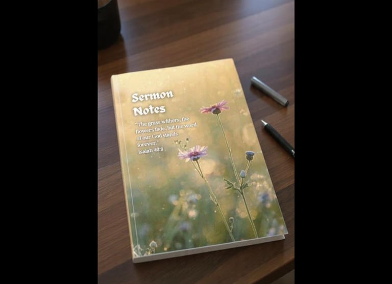 Grow in your faith one note at a time! This flower themed sermon notebook is the perfect place to capture insights, jot prayers, and reflect on God's word. Designed for church services, each page includes guided sections for verse references, sermon notes, and "Flourish in Faith" personal application.